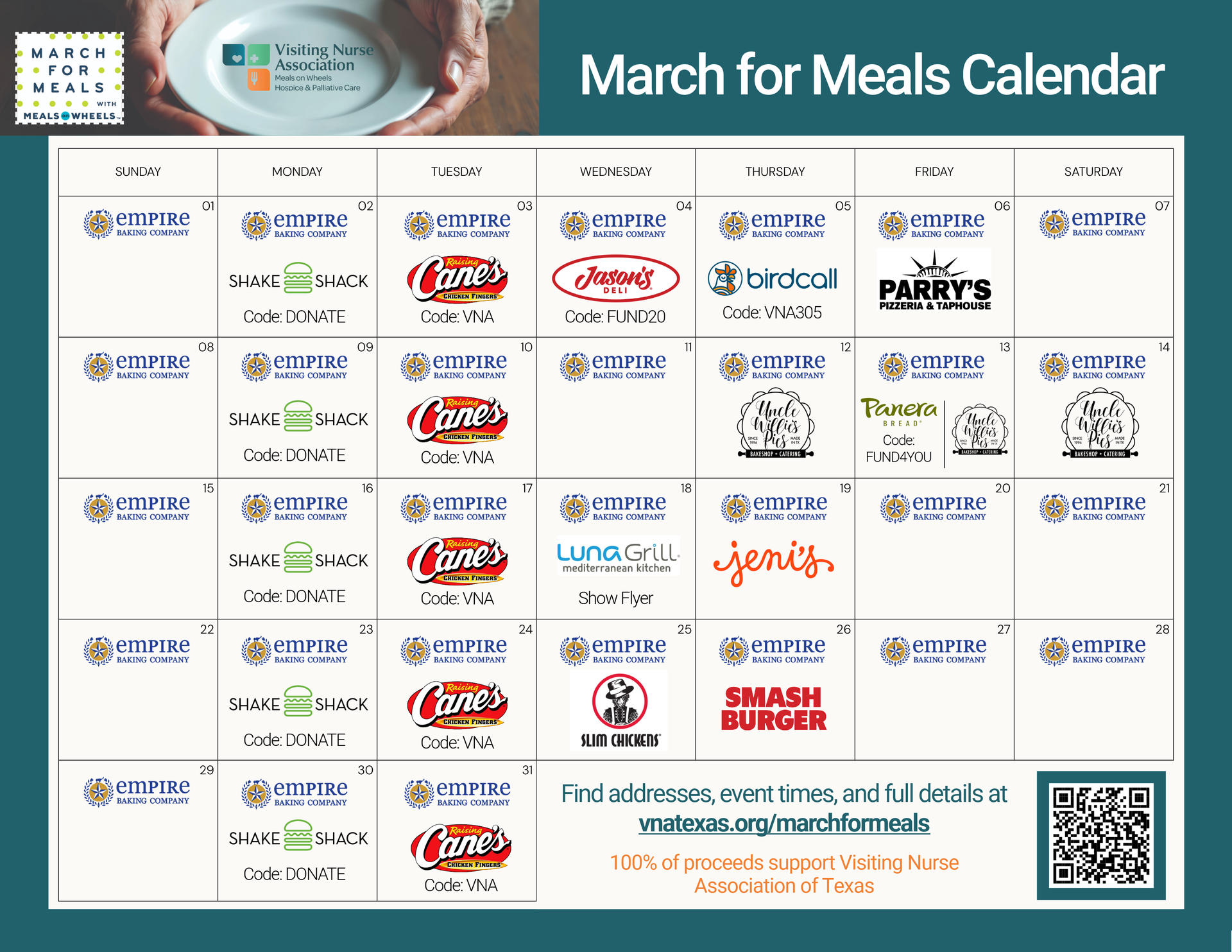 All month long, your favorite restaurants are giving back! Dine at the locations below and a portion of your purchase will support VNA. Explore the calendar above and visit The March for Meals webpage for full details on dates, times, codes, and more!